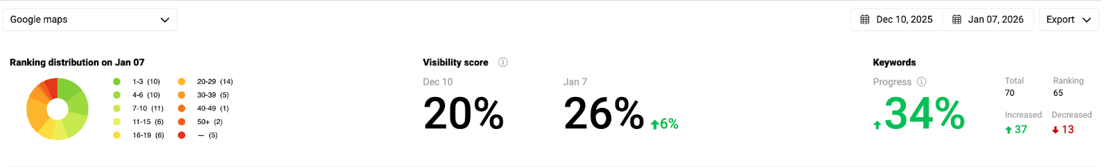 The ranking data backed up the business impact. We filtered for heater-related keywords and saw the visibility score increase from 20% to 26%, and keyword progress increase 34% overall, with 37 keywords improving and 13 declining. On January 7, the ranking distribution showed 10 keywords in positions 1-3, 10 in positions 4-6, and 11 in positions 7-10.