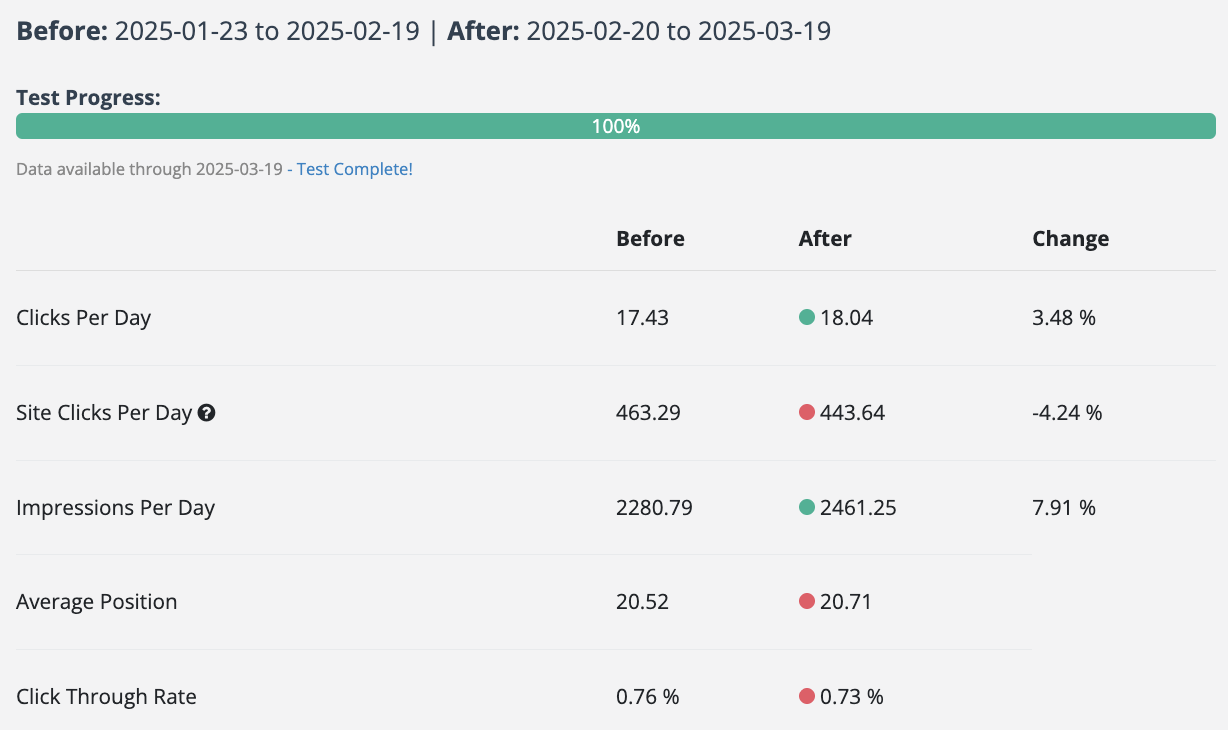 While the lifts here aren’t as dramatic as the single-page test, they’re still meaningful, especially considering the broader site was experiencing an overall decline in traffic during the same period.